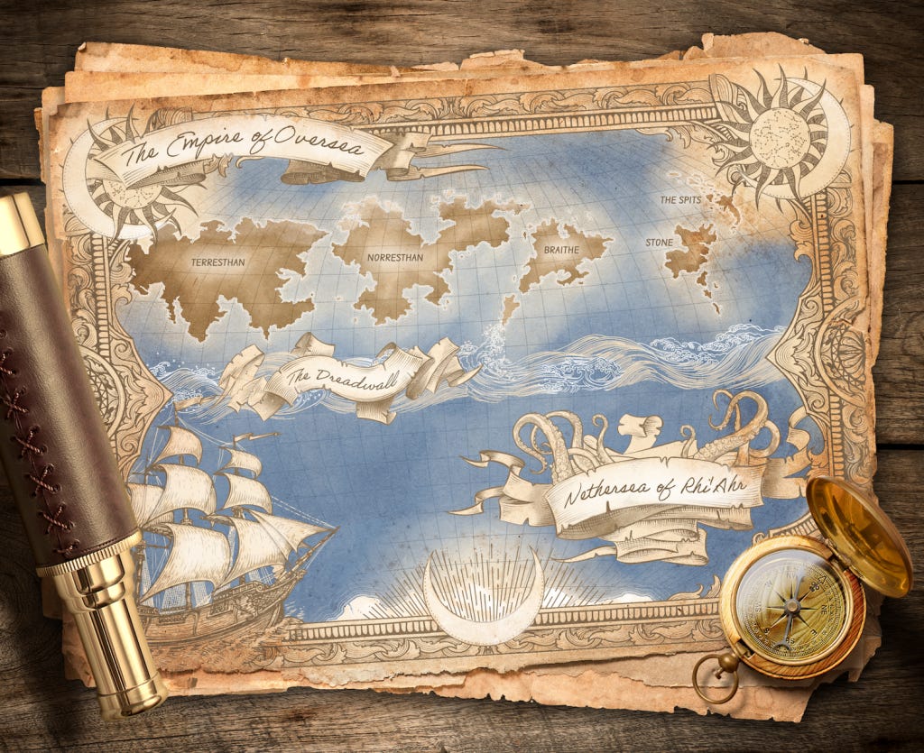 Touchstone is the legendary “Ship of Spells” that everyone hears about but never sees, mainly because of the cloaking spells active while in port. She’s got a history, and her crew is as rag-tag as they come, complete with a centaur, dwarves, and other magical creatures who aren’t quite human — er, homani, as they’re known on this planet. This is Pirates of the Caribbean by way of Narnia, if you will. The captain and his crew have been charged with patrolling the waters in an effort to curtail the war efforts of the Rhi’Ahr, dark elven-like people who live in the southern hemisphere and sneak through to the northern waters through cracks in the Dreadwall, a massive wall of water conjured up at the equator to divide the factions and prevent all-out war.
